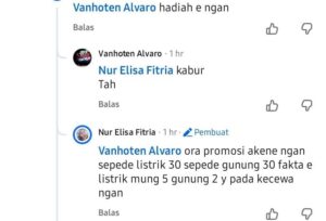 “Ora, promosi akene ngan sepede listrik 30 sepede gunung 30 fakta e listrik mung 5 gunung 2 y pada kecewa ngan (tidak, promosinya kan sepeda listrik 30, sepeda gunung 30, cuma faktanya sepeda listrik hanya 5, sepeda gunung 2, jadi pada kecewa,”Terang akun Nur Elisa Fitria mejawab pertanyaan akun Vanhoten Alvaro.